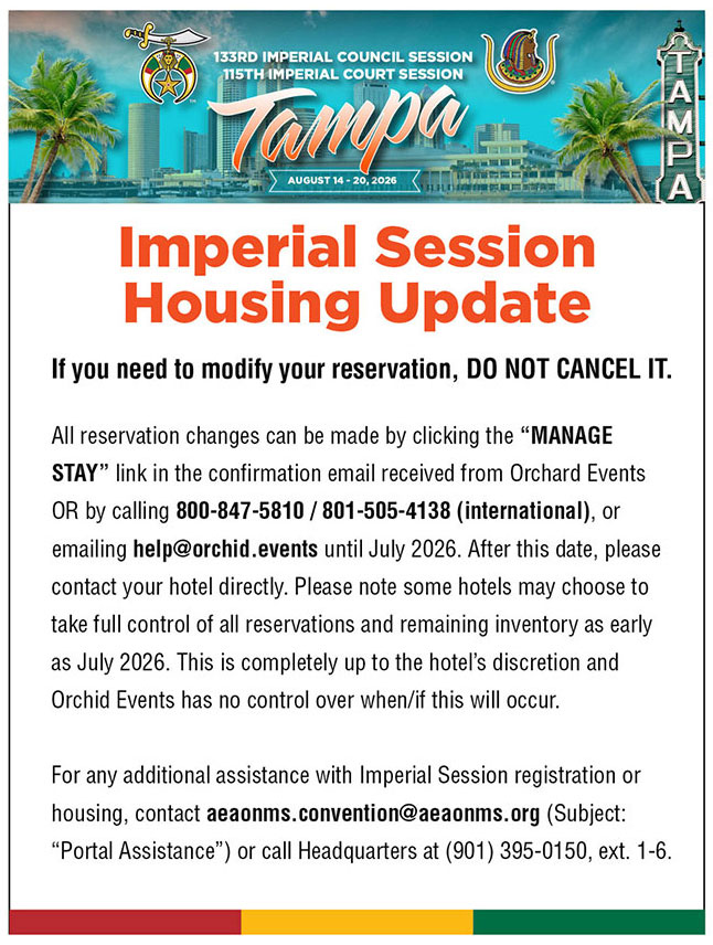 I bring you Greetings as the 47th Imperial Potentate of the Ancient Egyptian Arabic Order Nobles Mystic Shrine of North and South America and its Jurisdictions (A.E.A.O.N.M.S.), Inc.